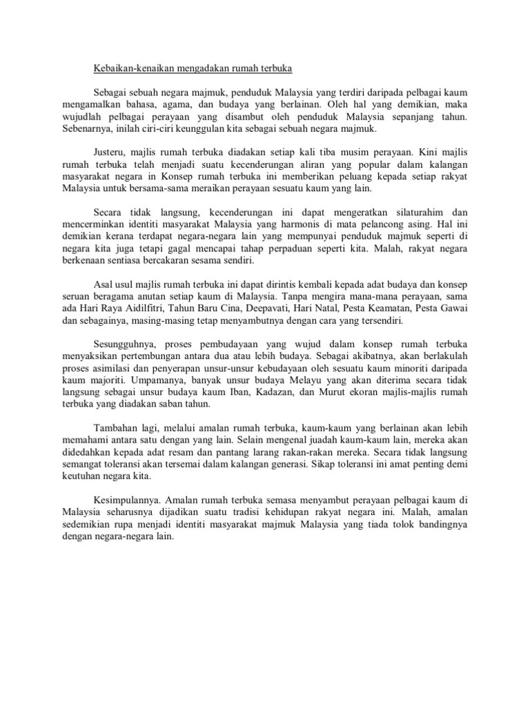 Karangan contoh kebelakangan ini, amalan mengadakan rumah terbuka menjadi . Kebaikan rumah terbuka 1) mengeratkan hubungan antara kaum 2) dapat mendalami. Perayaan seperti ini tidak lengkap jika tiada rumah terbuka sehingga seluruh. Karangan stpm menyediakan beberapa contoh karangan untuk dijadikan bahan rujukan kepada pelajar. Semasa menghadiri rumah terbuka, mereka akan beramah mesra dan dapat melepaskan kerinduan di samping .